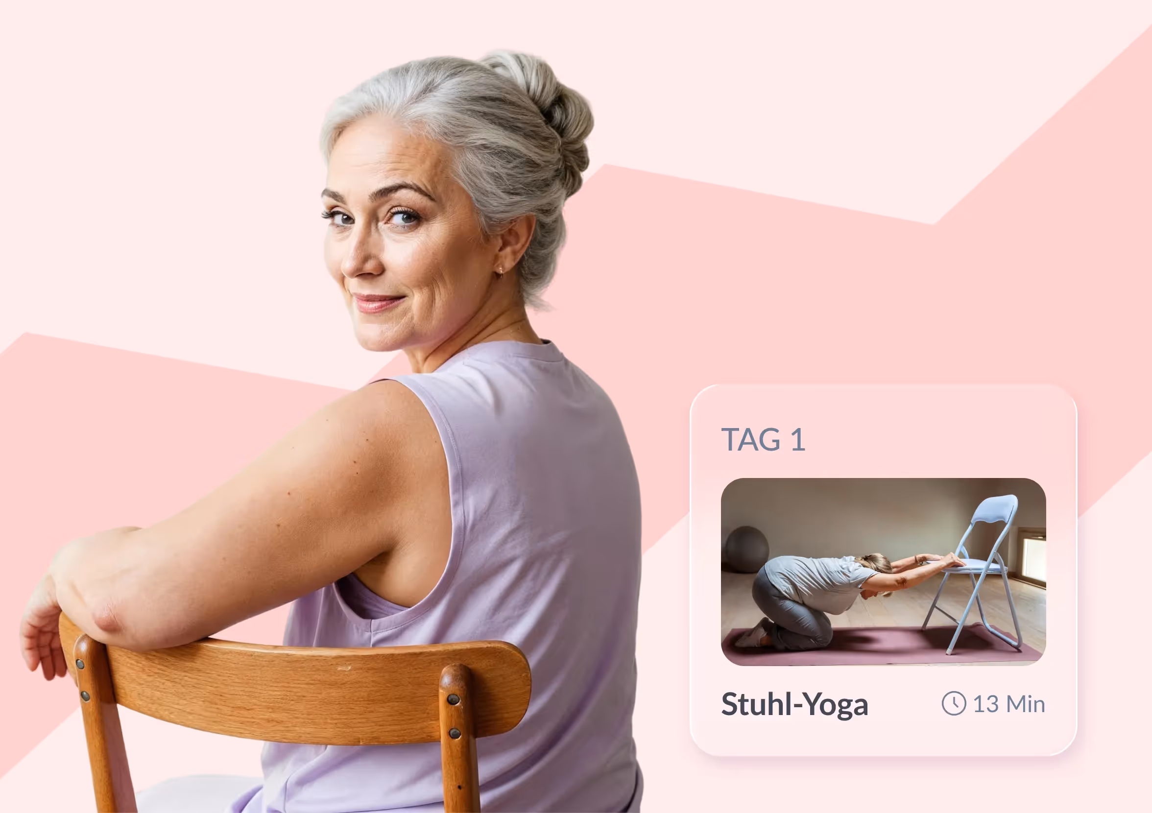 Sobald du dich angemeldet hast, hol dir die App aus deinem App Store. Im Fitness-Tab findest du deine erste Stuhl-Yoga-Einheit – und kannst sofort loslegen.